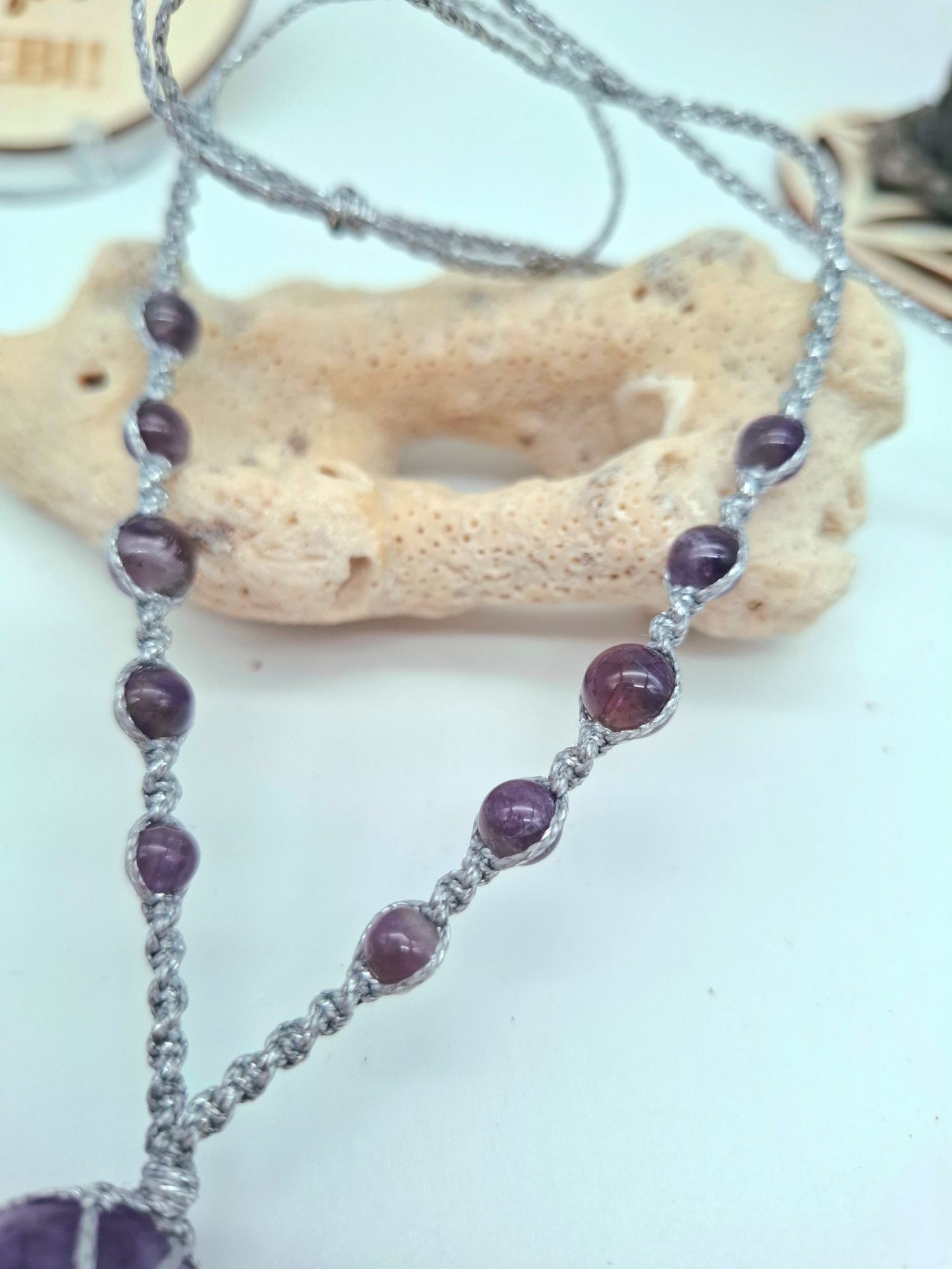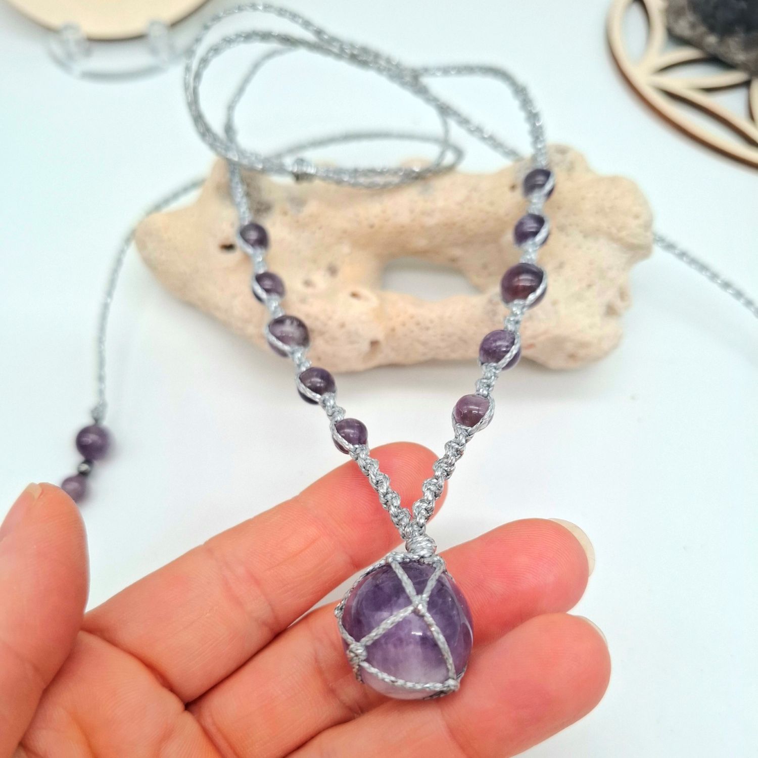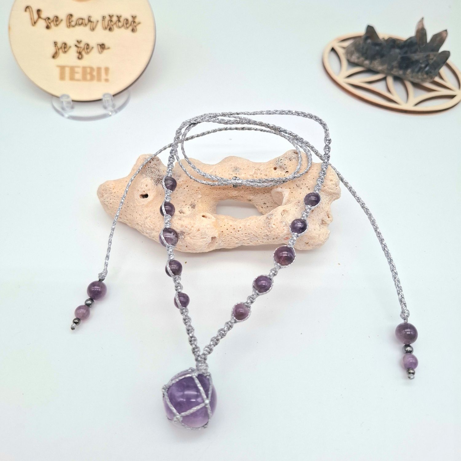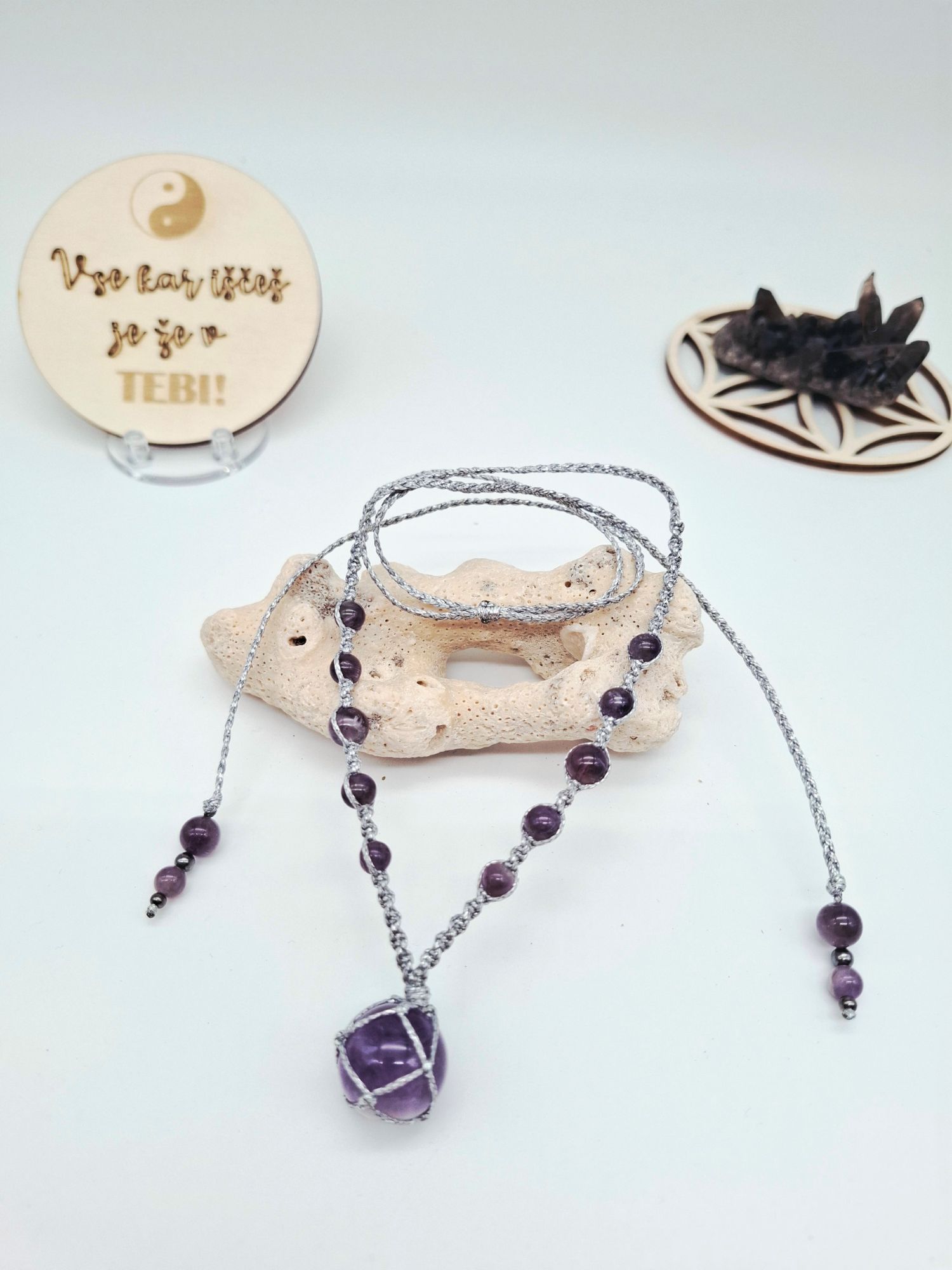 Skip to contentOgrlica s sfero ametista v makrame vezavi.