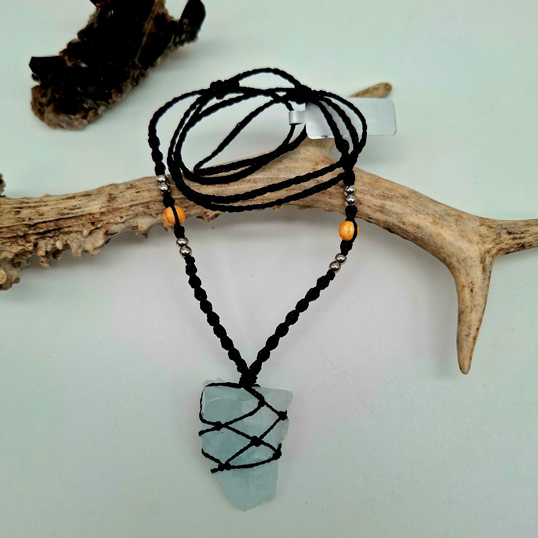 Skip to contentUnikatna ročno izdelana ogrlica, ki združuje surovi kristal akvamarina v obliki puščice in zaščitne perlice iz svetega lesa Palo Santo. Kristal je ovit v črno makrame vezavo, ki ga varno objame, hkrati pa pusti njegovo surovost popolnoma vidno.